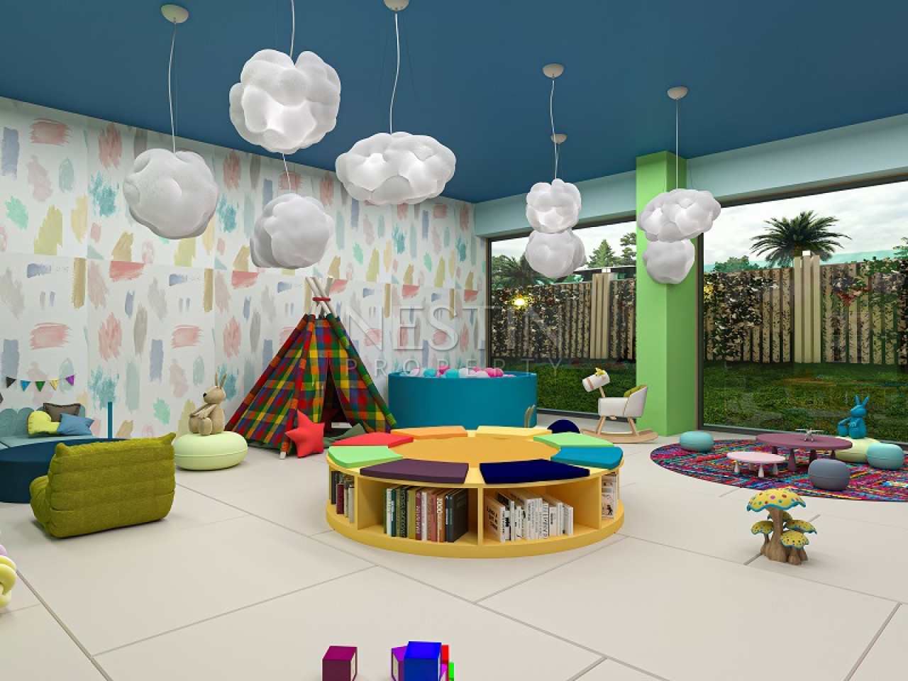 На территории дома есть бассейн, джакузи, сауна, фитнес, детская площадка, зоны отдыха, зеленый сад, охрана, видеонаблюдение.